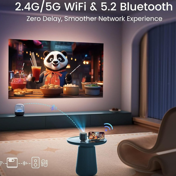 با استفاده از وایفای داخلی، میتوانید پروژکتور را به شبکه خانگی خود متصل کرده و به صورت بیسیم به اینترنت دسترسی پیدا کنید. همچنین، با استفاده از بلوتوث میتوانید هدفون یا اسپیکر بلوتوث خود را به پروژکتور متصل کرده و به صورت خصوصی به محتوا گوش دهید.